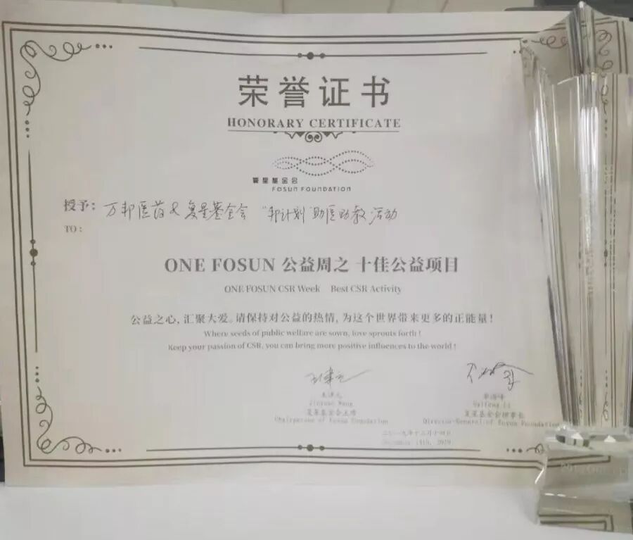 作为复星公益重要组成部分,万邦医药&复星基金会共创的“邦计划——助医助教”活动喜提十佳公益项目荣誉证书!